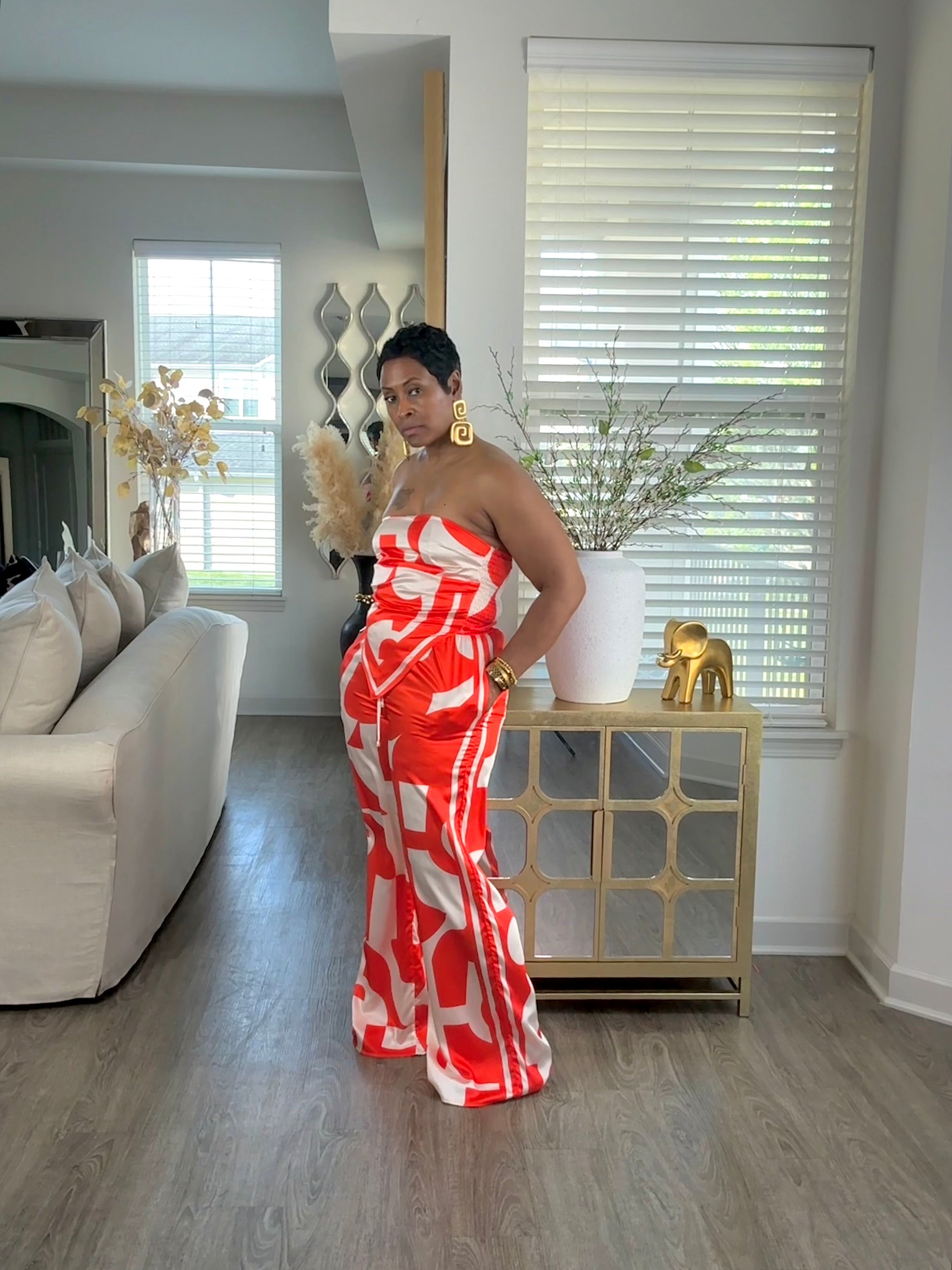 Turn Heads. Own The Moment. This strapless two piece brings bold energy with a flattering high waist fit and flowy wide leg finish. EFFORTLESS LUXE UNFORGETTABLE.